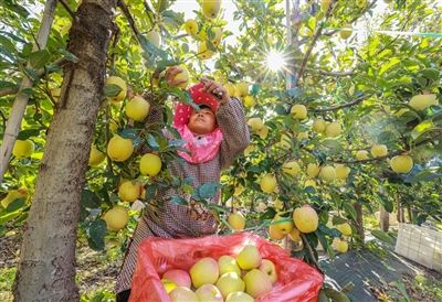 日前,在山东省荣成市夏庄镇一处现代果园里,果农在采摘苹果。近年来,该镇聚合龙头企业与专业合作社,带动果园、果企、果农实现标准化种植、品牌化营销,助力乡村振兴。