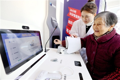 2月16日,在浙江省湖州市德清县阜溪街道兴山未来社区居家养老服务中心,家庭医生为社区老人“云问诊”。