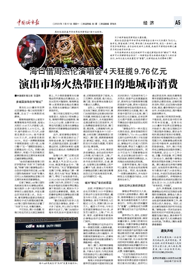 周杰伦2023嘉年华世界巡回演唱会让海口4天狂揽9.76亿元;张学友、郭富城澳门开唱,带旺澳门本地旅游市场,酒店一房难订;南京因多场演唱会、音乐会的定档冲上热搜,来南京开演唱会的薛之谦买不到去南京的车票……