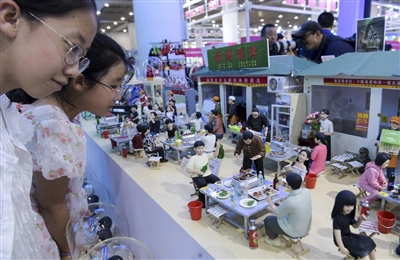 8月18日至20日,“好品山东·淄博美物”展销会在山东济南举行。本次展销会围绕现代产业、乡村振兴、文化“两创”等主题,设置了八大展区;共有400多家企业带来了智能制造、高端装备、陶琉纺织等淄博美物。图为参观者在展销会现场观赏软陶微景观“淄博烧烤”。