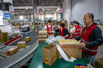10月31日晚,淘宝、京东等电商平台开启第一波“双11”购物活动。浙江省金华市金义综合保税区内的跨境电商企业通宵加班加点,争取第一时间将跨境商品发至全国客户手中。图为金华市金义综合保税区垂直云仓内,工作人员将“双11”包裹拣货、包装,陆续装车发货。