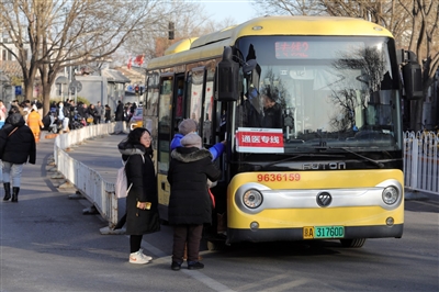 1月2日起,北京公交集团试点开行6条通医专线,服务广安门医院、东直门医院、垂杨柳医院、海淀医院等7所医院,解决群众的就医出行难题,同时兼顾服务其他生活出行,加强社区接驳地铁的便捷性。图为通医专线2抵达积水潭医院站,人们正排队上车。