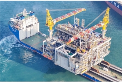 10月24日,在山东青岛海事部门办理完国际航行船舶出口岸手续后,“祥安口”号半潜船装载着马赞油气田PKG-1项目气体压缩平台从青岛西海岸新区起运出境。
