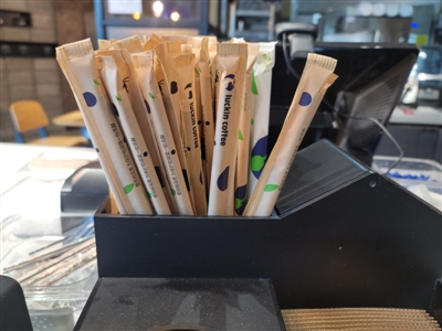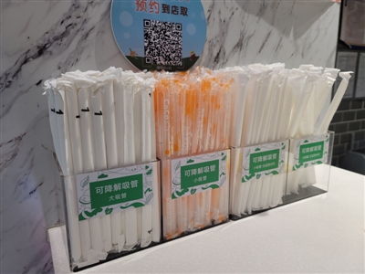 记者随机走访了北京几家饮品店,其中都可茶饮为顾客提供4种类型的吸管,均有“可降解吸管”标识;瑞幸咖啡为顾客提供纸质吸管;蜜雪冰城则提供粗、细2类吸管。“细的是可降解塑料的,粗的是纸的。纸吸管用得更多,可以喝带珍珠或果肉的饮品。”蜜雪冰城店员小何告诉记者。
