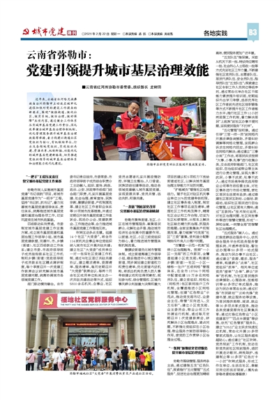 近年来,云南省红河哈尼族彝族自治州弥勒市主动适应城市化进程加快对党的建设工作提出的新要求,围绕“做强街道、做优社区、做实系统、做活治理、做好保障”五项内容,通过健全工作体系压实城市基层党建工作责任、深化改革健全城市基层治理体制机制、优化管理服务提升城市基层治理效能等举措,着力构建以街道社区党组织为核心,有机联结单位、行业及各领域党组织,实现组织共建、资源共享、机制衔接、功能优化的城市基层党建新格局,切实推进党组织领导的城市基层治理体系和治理能力现代化建设。