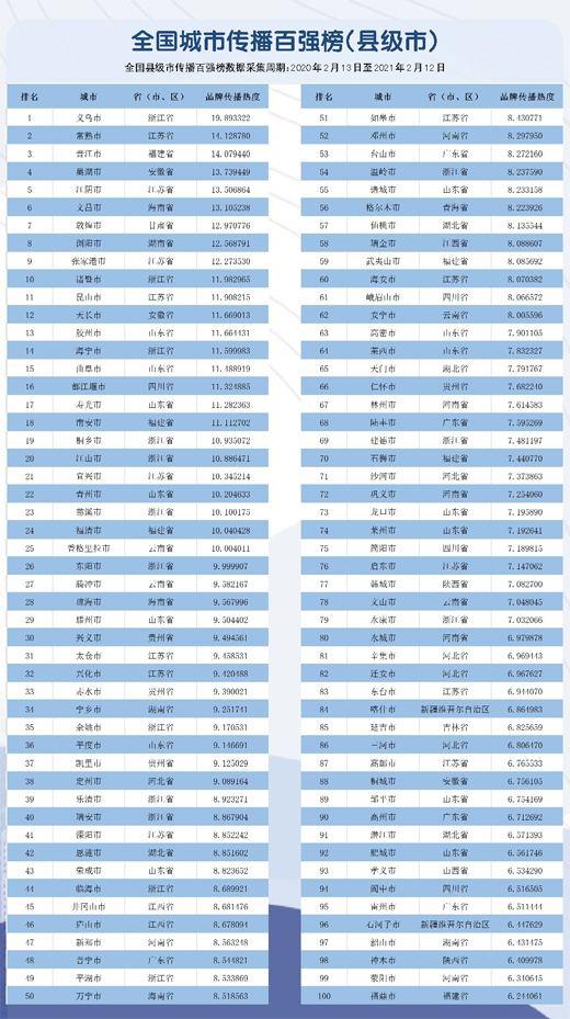 近日,2021全国城市传播热度排名发布会在人民日报社举行。中国城市品牌评价项目组、中国城市报社联合清华大学国家形象传播研究中心,根据国家统计局和微热点大数据研究院数据及相关标准,对全国261座地级市(不含省会以上城市)、393座县级市最近一年(2020年2月13日至2021年2月12日)有关数据进行标准化计算,分别发布地级市和县级市传播热度指数排名前100的城市名单。