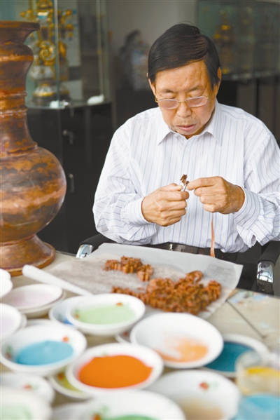此后的数年里,张同禄又被下放到车间,由于没有具体职位,他只好在各车间来回蹿,这儿干几个月,那儿干几个月。“600多年来,景泰蓝的设计、制胎、掐丝、点蓝、烧制、磨活、镀金等工序都是各干各的,匠人对别的工序一点不了解,我却把所有工艺都学会了。”张同禄自豪地告诉记者,从这个方面来说,在景泰蓝史上,他可能还真是“前无古人”。那一刻,匠人对艺术独有的热忱在他已略显浑浊的双眼中绽放出点点星光。