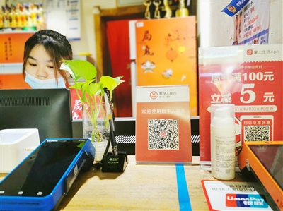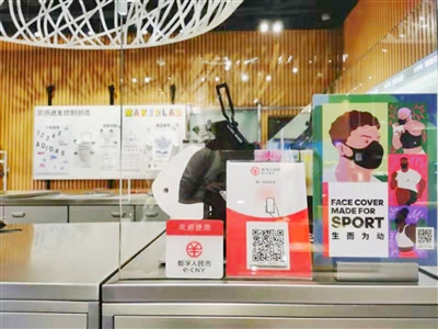 日前,记者在王府井商业街走访了多家商场店铺,看到大部分店面的收银台上摆放着数字人民币支付标牌。