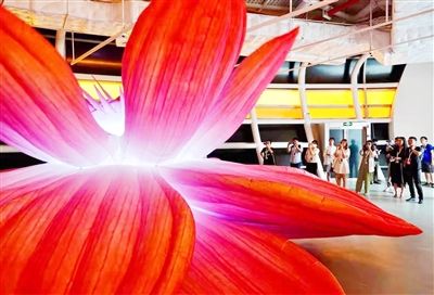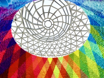 随后,记者来到海花岛博物馆5号馆,一道环形的白色幕墙挡住了视线——艺术家借助天光,设计了一条视觉净化的狭长白色走廊,在走廊尽头,色彩斑斓的绮丽纱布让人眼前豁然一亮。80000块彩纱、60000颗气钉、12位工人连续5天的工作,以彩虹装置闻名的墨西哥艺术家加布里埃尔·达维的作品《光场》以人工的方式重现自然和生命,使观众获得深层次的解读和思考。