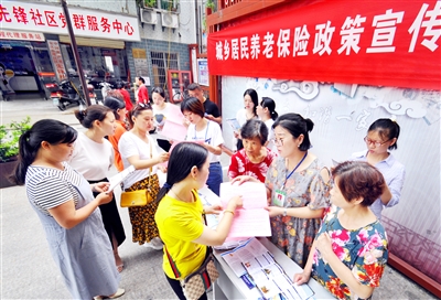 在安徽省安庆市迎江区先锋社区活动广场,社保专干针对今年城乡居民养老参保缴费新政策进行细致讲解和宣传。 |