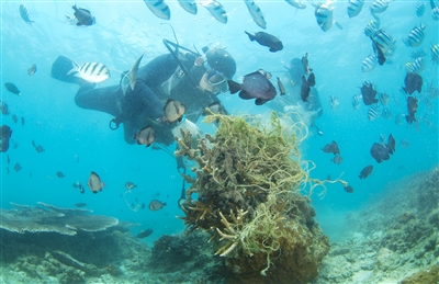 在海南省三亚市蜈支洲岛海域,工作人员在海底清理缠绕在珊瑚上的渔网和绳子。日前,台风“康森”给三亚带来大量降水,同时也给三亚近海带来不少海洋垃圾。“康森”刚过,海南三亚蜈支洲岛旅游区的工作人员便抓紧清理海滩上和海洋中的垃圾。