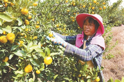 江西省抚州市南丰县果农在橘园采摘蜜橘。 |