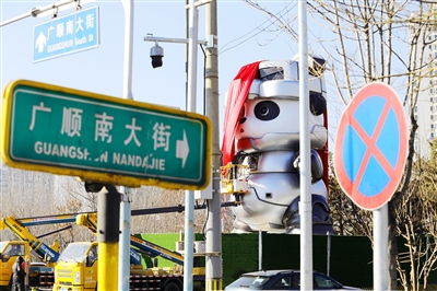 近日,一座新版熊猫雕塑作品在北京朝阳区望京街头亮相,成为望京的新地标。新版熊猫雕塑身穿机甲十分威武,市民直呼“有点酷”。