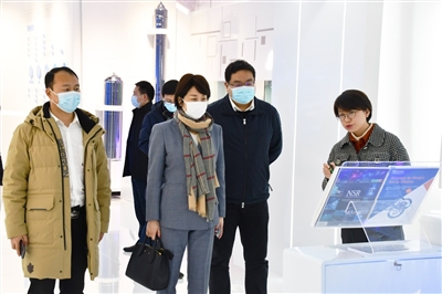 上海市松江区委常委、宣传部部长张磊(右二)陪同中国城市报总编辑杜英姿(左二)参观长三角G60科创走廊展示厅。 |