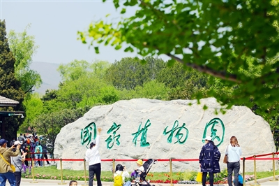 作为国家植物园体系的重要组成部分,国家植物园4月18日在北京正式揭牌,中国生物多样性保护事业再次迈出新步伐。此次设立的国家植物园,是在中国科学院植物研究所(南园)和北京市植物园(北园)现有条件的基础上扩容增效整合而成,总规划面积近600公顷。图为游客在国家植物园入口处参观。