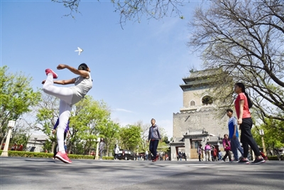 北京中轴线—居民在钟鼓楼广场踢毽子。张传东摄 |