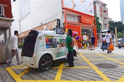 近日,在广东省广州市非遗街区(北京路)投入使用的无人零售车尽显科技范儿,市民可通过扫码支付购买非遗产品。中新社发许建梅摄 |