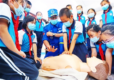 6月23日,河北省秦皇岛市海港区东港镇第一小学组织开展“防溺水知识进校园”活动,邀请蓝天救援队成员走进学校,为学生普及心肺复苏、救生衣的正确穿戴、溺水救援等内容,并为学生讲解预防溺水相关知识,增强学生的安全意识。