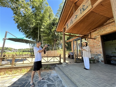 长沙市望城区茶亭镇“某谭小院”经营者谭葑姣(右)正在录制介绍人文景观的视频。 |