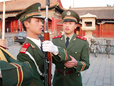 2005年5月,在天安门国旗护卫队驻地,时任国旗护卫队班长的徐宏伟在给队员纠正原地操枪动作。 |