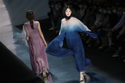 近日,中国国际时装周(2023春夏系列)在北京举行。今年是中国国际时装周创办25周年,本季时装周以“恒动焕新”为主题,300余位国内外设计师通过134场各类时尚活动,发布明年春夏季流行趋势。图为中国国际时装周T台秀上,模特展示设计师林栖设计的时装。