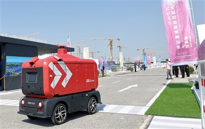 京东物流智能快递车在会展室外进行演示。 |