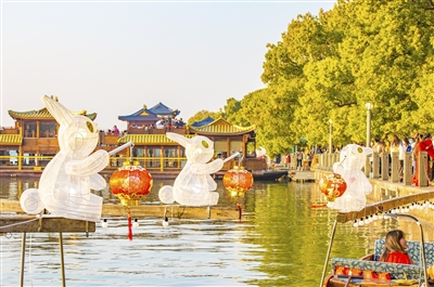 随着农历癸卯兔年临近,日前,30艘装有“玉兔灯”的手划船集中亮相浙江杭州西湖,供市民游客乘坐、赏灯游玩,热热闹闹迎接新春佳节。