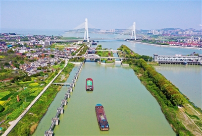 图为4月7日,货船依次通过巢湖船闸。