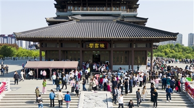 游客打卡位于山东淄博齐盛湖公园的网红书店海岱楼钟书阁。 |