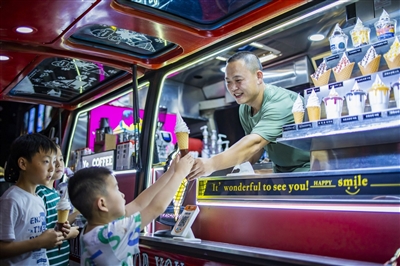 重庆市沙坪坝区小龙坎街道的星河集市成立于今年5月,为市民提供了就业和创业机会,集市还设有大学生、下岗职工、残疾人等特色摊位。图为7月6日,小朋友在星河集市购买冰淇淋。