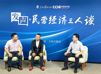 郭朝先(左一)、杨子腾(中)、董志龙围绕知识产权助力支持民营企业更好更快发展,展开深入探讨。 |