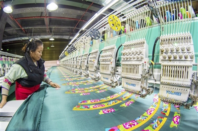 近日,在贵州省黔东南苗族侗族自治州从江县贯洞镇美娥社区的从江祖英刺绣有限公司生产车间内,工人在操作电脑绣花机赶制刺绣订单。近年来,从江县依托当地少数民族服饰传统技艺,加大对民族刺绣产业的扶持力度,鼓励非遗传承人在传承传统刺绣技艺的基础上,引进电脑绣花机等设备,提高工效、降低成本,使刺绣老工艺焕发新生机。