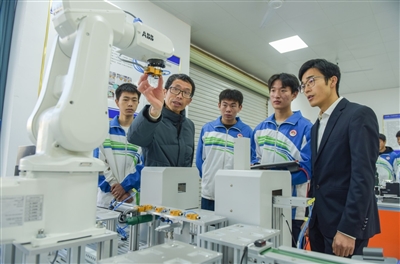 近年来,江西省吉安市吉水县井冈山经贸学校不断推进产教融合,加强学生实践技能,打造工业机器人多功能综合应用实训装置实训室,在增强学生学习兴趣的同时提高学生职业技术水平。图为12月7日,吉安市吉水县井冈山经贸学校内,老师指导学生操作工业机器人。