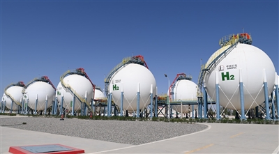 2023年8月30日,我国首个万吨级光伏发电直接制绿氢项目——新疆库车绿氢示范项目全面建成投产。随着配套光伏电站实现全容量并网,该项目可以满负荷生产绿氢,每年生产的2万吨绿氢全部就近供应中国石化塔河炼化公司,每年可减少二氧化碳排放约48.5万吨。图为中国石化新疆库车绿氢示范项目储氢球罐装置区。 |