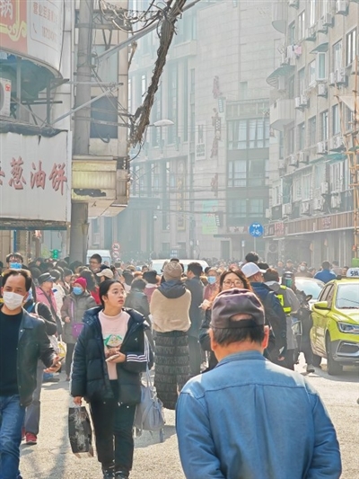 上海市黄河路某排骨年糕门店前,近日聚满了游客、食客。陈鹏程摄 |