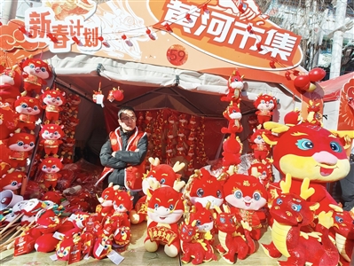 春节假期,在甘肃省兰州市城关区黄河市集内,售卖龙公仔的摊位气氛喜庆。 |