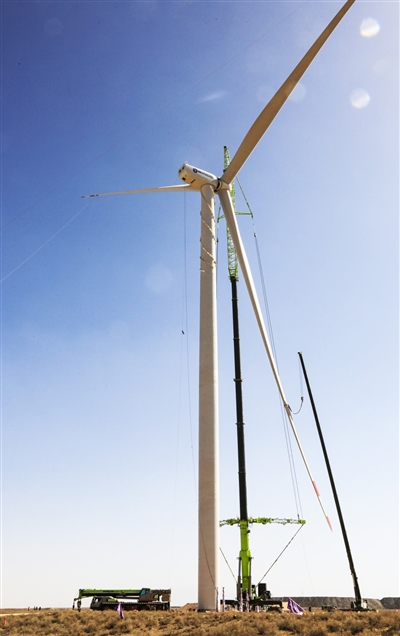 3月20日,在甘肃省张掖市甘州区平山湖风电项目施工现场,工人们忙着吊装风力发电机的叶片。