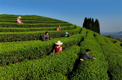 日前,在四川省泸州市纳溪区护国镇德红村红岩子茶园,茶农们抢抓农时采摘“明前茶”。