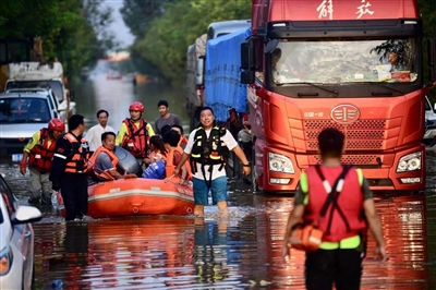 北京绿舟应急救援队队员在2021年河南郑州“7·20”特大暴雨救灾现场进行救援工作。 |