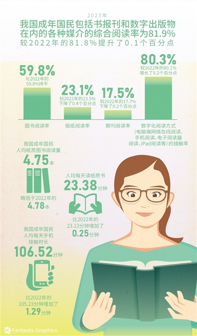 国民阅读调查报告出炉:2023年人均纸质书阅读量4.75本。 |