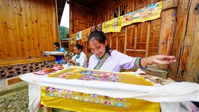 7月10日,在贵州省黔东南苗族侗族自治州榕江县朗洞镇色边村,绣娘正在赶制非遗文创刺绣订单产品。近年来,榕江县结合本地少数民族群众擅长刺绣的特点,采取“合作社+非遗+文创+订单”的模式,将少数民族服饰、刺绣、蜡染等非遗手工产品通过设计创新、线上线下订单销售等,推向国内外市场,带动当地掌握手工技艺的少数民族妇女在家门口就业,增加收入。