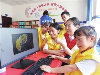 近年来,四川省达州市委网信办会同市妇联、共青团等在全市9个县(市、区)重点打造40多个乡镇“阳光驿站”和100多个村“农家书屋”,选配优秀党员志愿者到“阳光驿站”任暑期教师,组织农村留守儿童学生、幼儿利用暑假到“阳光驿站”免费学习围棋、象棋、五子棋、绘画、书法等。图为8月1日,达州市万源市石塘镇的社区“阳光驿站”内,党员志愿者引导留守儿童绿色上网。 |