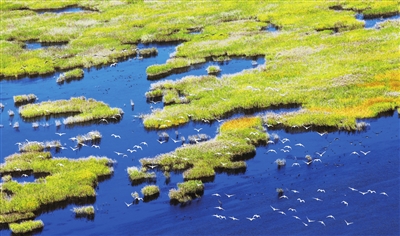 中国城市报记者了解到,在河流淡水湿地,黄河三角洲自然保护区按照生态学要求设置大缓坡和深水区引进黄河水,建设鸟类繁殖岛、鱼类栖息地;结合下游漫滩补水需水量,系统考虑鱼鸟生物关系,设置快速过水通道,形成“河流水系循环连通、原生湿地保育补水、鱼虾生物繁衍生息、野生鸟类觅食筑巢”的生物多样性湿地。