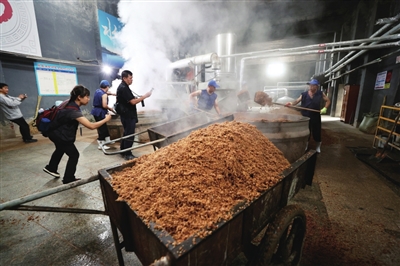 承德九龙醉酒文化产业园古窖池遗址,距今已有300多年的历史。图为九龙醉酒厂工人在蒸制酒醅。 |