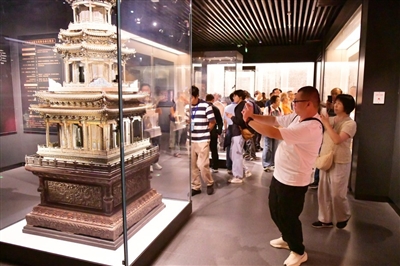 承德博物馆以其独特的建筑设计、丰富的展览内容和深厚的文化底蕴,成为承德市文化地标之一。图为游客、媒体记者参观打卡承德博物馆。 |