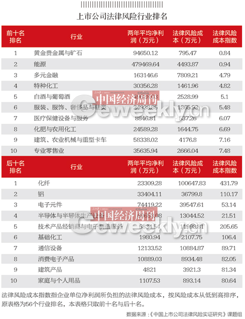 在“行业榜”中,能源、建筑、重工类的名次普遍靠前(风险较低)。叶晓华说:“这几个行业中的上市公司普遍是大公司,在社会责任、美誉度等方面都颇受好评,对法律风险的控制也更为重视。”而轻工业、通信和电子商品类的名次较为落后。