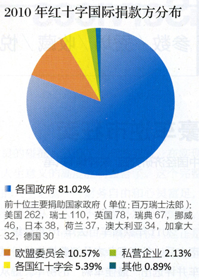 今年,红十字国际主席克伦贝格尔在日内瓦召开的新闻发布会上发布了《红十字国际委员会2010年年度报告》。报告显示2010年,红十字国际的开支达到历史最高点,超过11亿瑞士法郎(根据2010年平均汇率,约合11亿美元)。就预算而言,红十字国际在巴基斯坦所开展的行动规模最大,其次是阿富汗、伊拉克、索马里、苏丹、刚果民主共和国和以色列及被占领土。