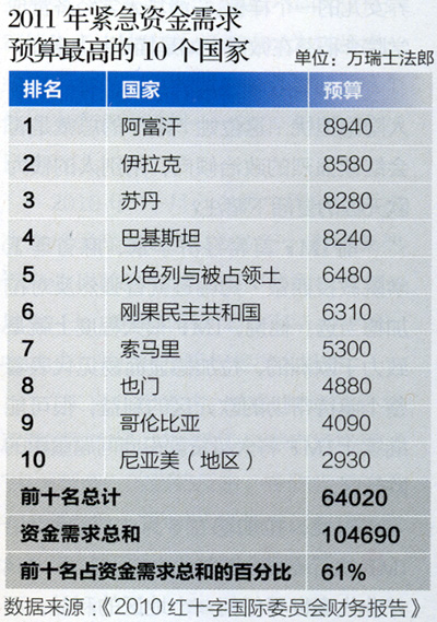 在红十字国际公布的2011年资金需求中,这一数字再创新高达到12.304亿瑞士法郎,其中包括总部资金需求1.835亿瑞士法郎和紧急资金需求10.469亿瑞士法郎。与2010年的数据(不包括该年发生的任何额外预算追加)相比,今年的最初紧急资金需求增加了1.105亿瑞士法郎(增幅为11.8%)。