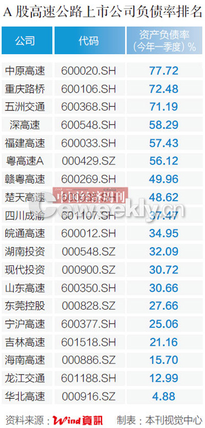 《中国经济周刊》梳理出“A股高速公路上市公司负债率排名”,据统计,在今年一季报中,19家高速公路上市公司的负债总额超过1000亿元。负债率排名前十公司依次为中原高速、重庆路桥、五洲交通、深高速、福建高速、粤高速A、赣粤高速、楚天高速、四川成渝、皖通高速。