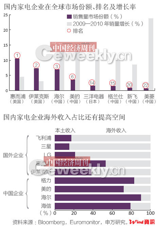 海尔集团提供的数据显示,海尔白电在欧洲地区的营业额实现了40.9%的大幅增长;在美国,海尔冷柜进入市场前三。2008年,海尔在印度布局设厂;2011年,海尔收购三洋电机,将通过自有品牌“海尔”和三洋的“AQUA”进一步拓宽其海外市场。